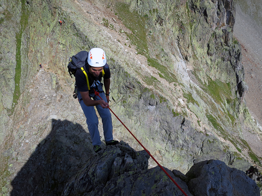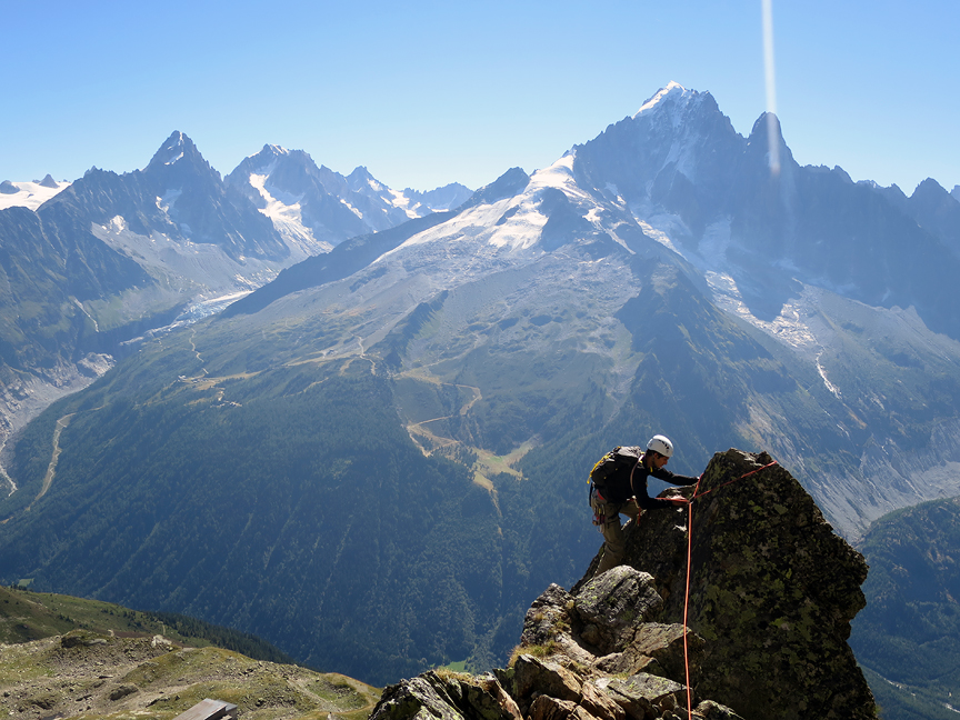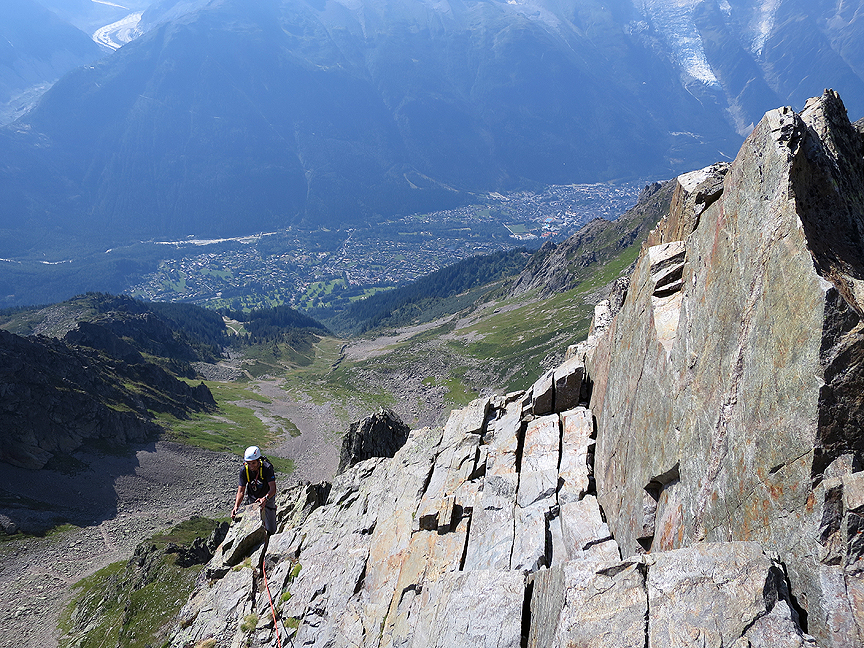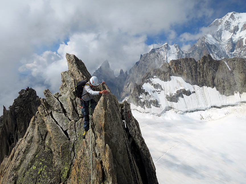 Traversing the small tower on Pitch 6. In the background on the left are the Aiguille du Chardonnet, and the Aiguille d'Argentière. On the right are the Aiguille Verte and Les Drus. |