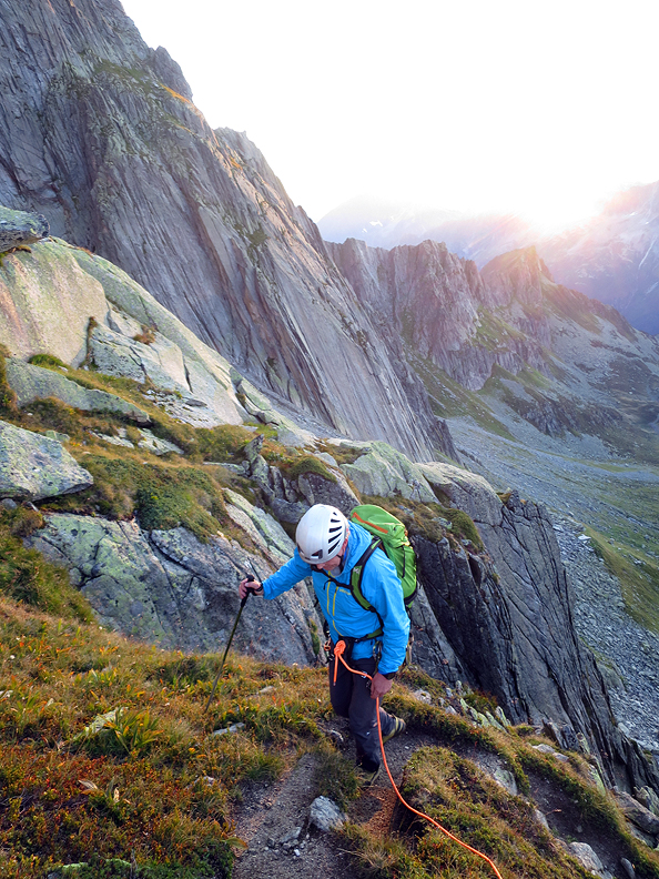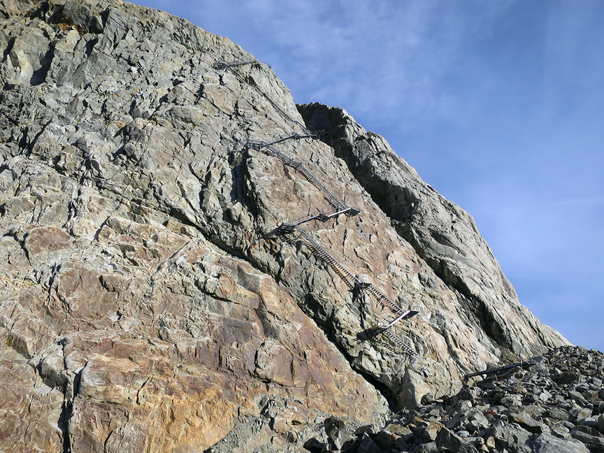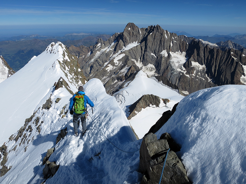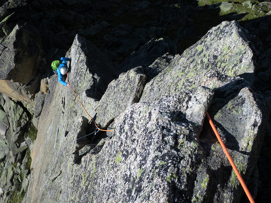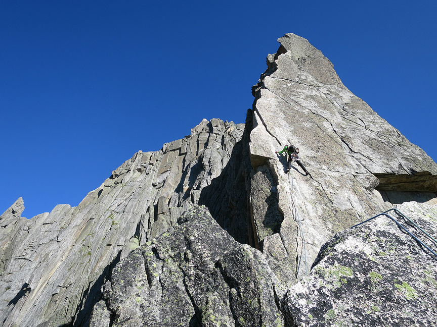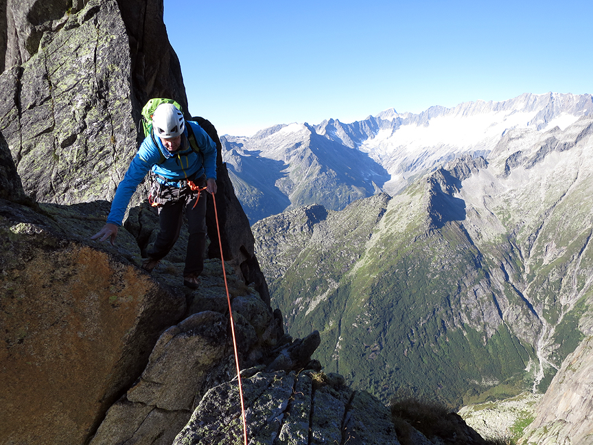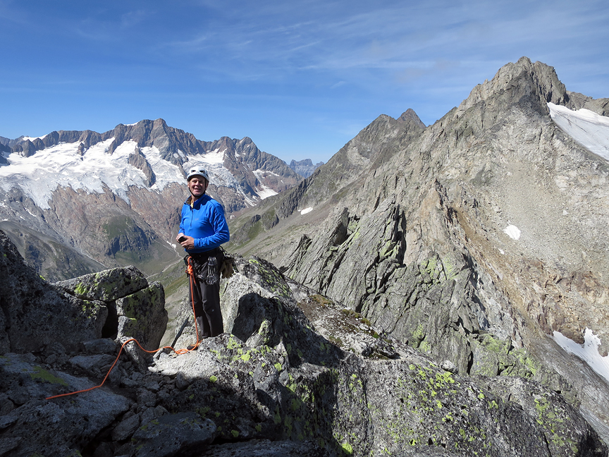 Once again, Grant joined Mark for a bout of climbing in the Alps. We enjoyed 6 days of nearly flawless weather, then last hoorah of summer, it seems. The previous week however, brought new snow to the high peaks, and we needed to choose our objectives with that in mind. We began with a "smaller" peak, the Salbitschijen in central Switzerland. The local guidebook claims that the South Ridge is "the best granite ridge climb in the Alps". Only one way to find out... |