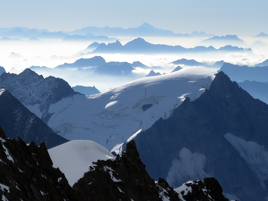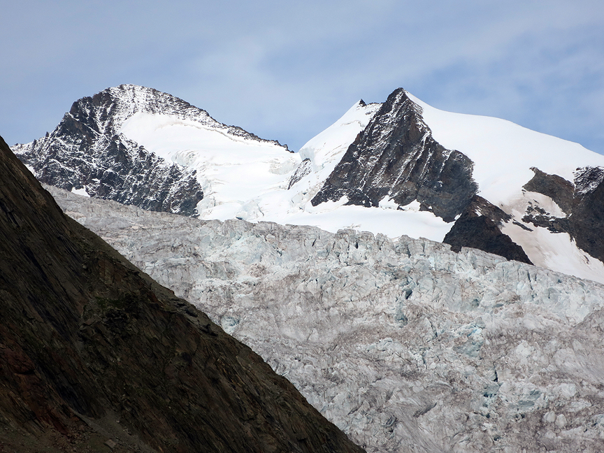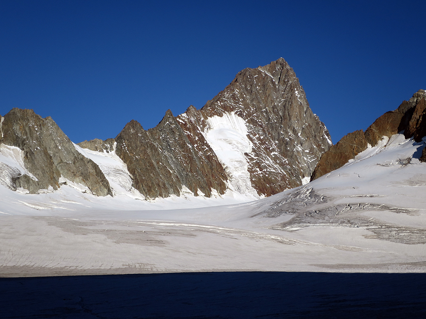 We spent another night in the Konkordia hut. And the following day, rose early to hike out to Grimsel. Here is another view of the Finsteraarhorn, from the SE as we approach the Oberaarjoch. |