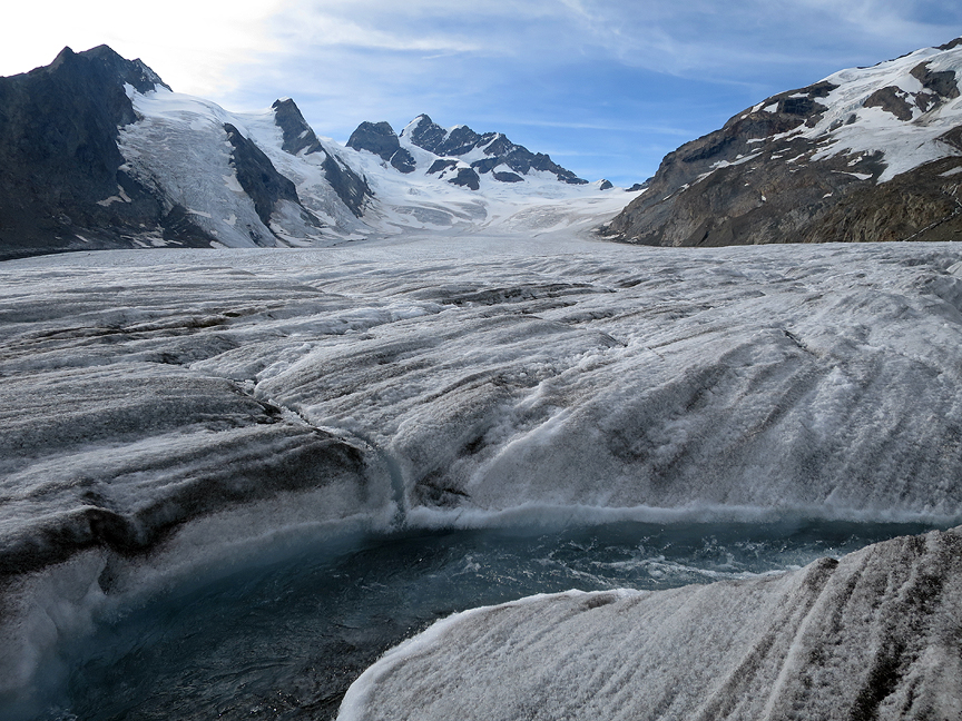 After a leisurely start the next morning, we drove to Grindelwald, hopped on the train to the Jungfraujoch, and then walked down the glacier to the Konkordia hut. This photo is from Konkordiaplatz, looking back up-glacier to the Jungfraujoch. We arrived just in time for dinner. |