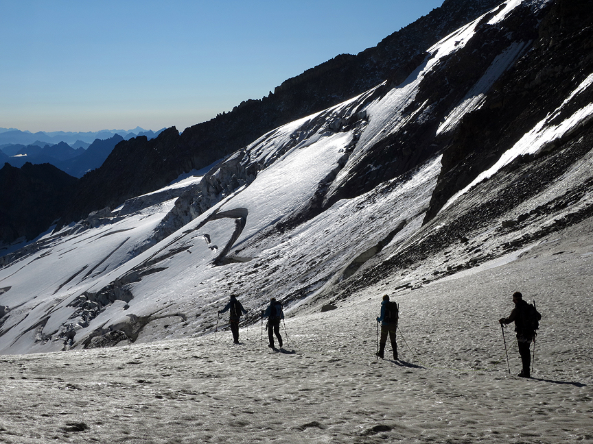 From the Oberaarjoch, we descend the Oberaar Glacier. Another party, just starting down from the joch. |