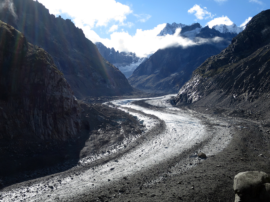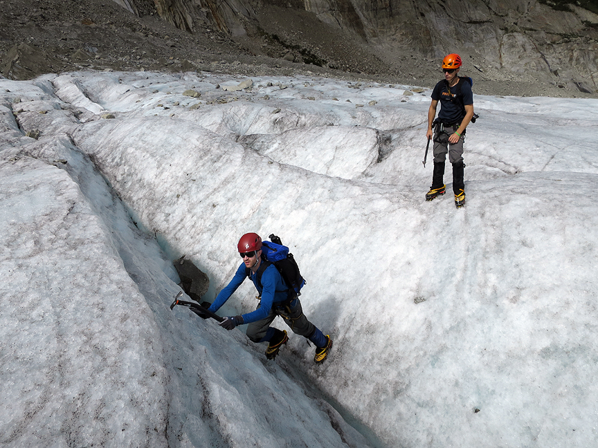 The Mer de Glace the morning of our first day. We wandered up-glacier to the point where the glacier takes a right-hand turn (from our perspective) and found some fun walls for play and instruction. |