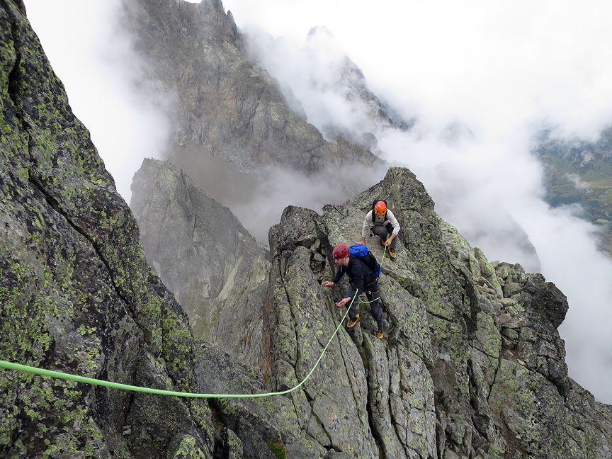 On our second day we did the Traverse of the Aiguilles Crochues. We were in and out of cloud all day, but stayed, thankfully, dry. |