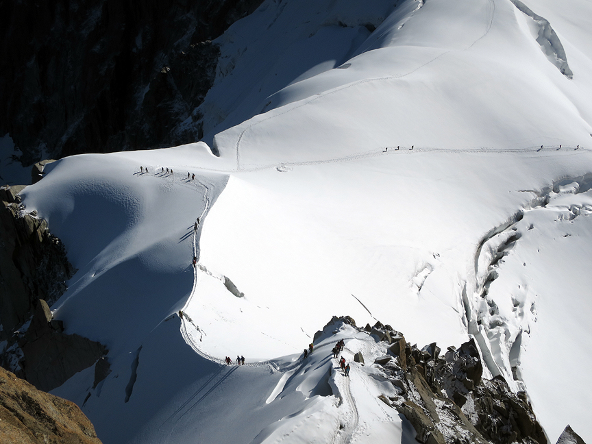 On our third day, we opted for the scenic Traverse of the Vallée Blanche. From the top of the Aiguille du Midi, we took the Panoramic lift across the glacier to the Franco-Italian border, then walked back across the Traverse to the Midi. This photo was taken from the top of the Midi on our way over. It shows the rather exciting finish climb back up to the Midi. |