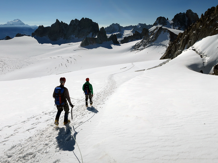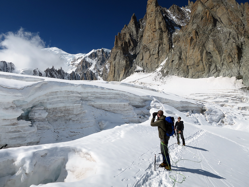 Pausing to appreciate the crevasses. Mont Blanc is the distant dome on the left-hand skyline. |
