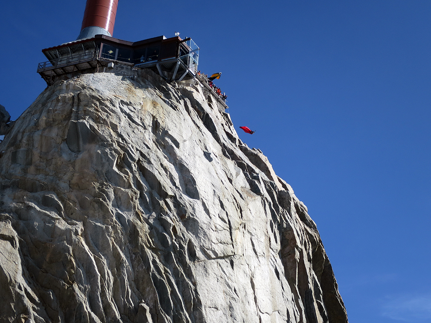 Wingsuit jumpers from summit of the Midi. |