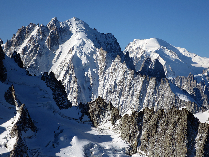 The view towards the Aiguille Verte and Mont Blanc from the summit of the Aiguille du Tour. |