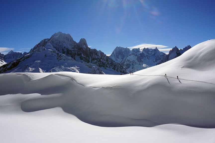 Above Lac Blanc. The Aiguille Verte and Les Drus on the left with the Grandes Jorasses in the center. We are not alone. |