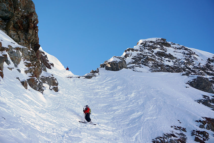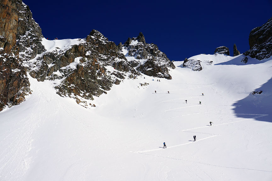 A very busy day on the Col de Beaugeant. The route heads left across the rocks from the highest skiers. You can make out others at the col proper in the upper left-had corner of the photo. |