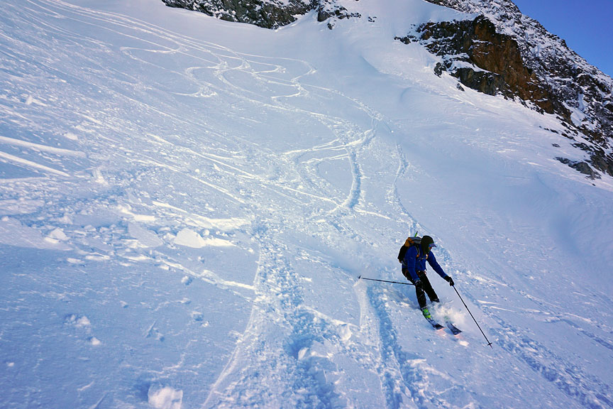 Unfortunately, the snow was a bit disappointing on the descent. Some crusty nastiness. A few days before, it had rained to a very high altitude and the crust was quite evident. Jim copes well, however. |