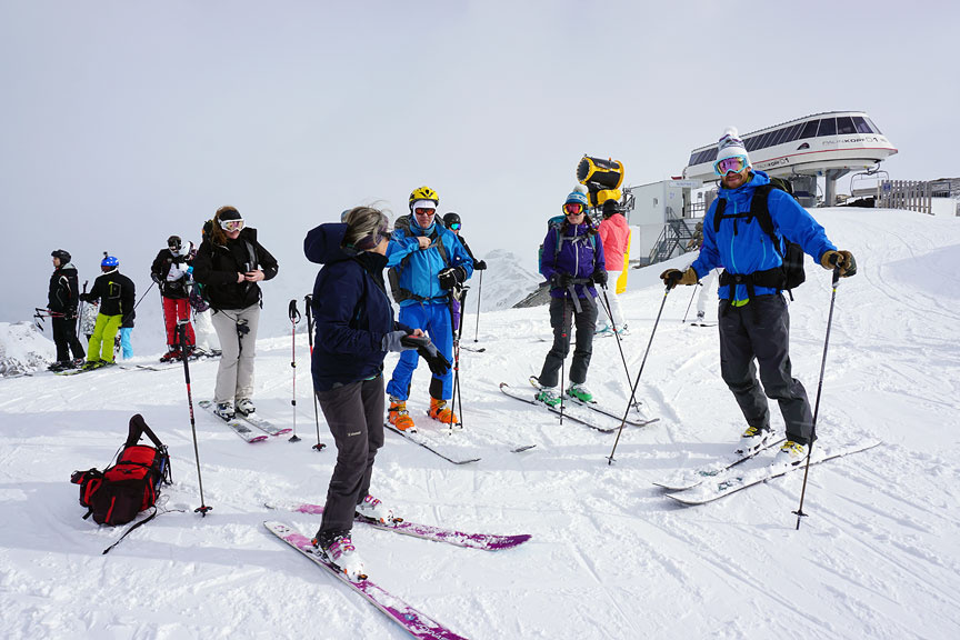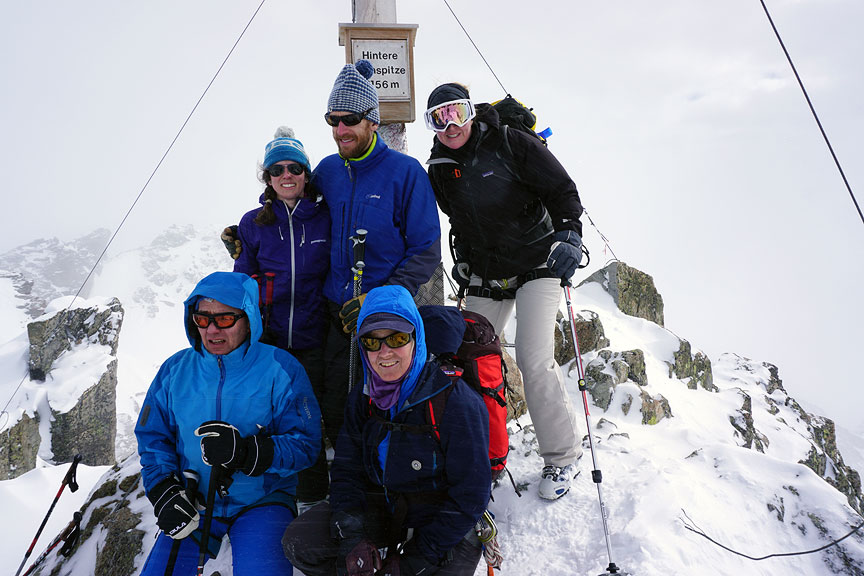 Day one: we ride through the bustling metropolis of the Ischgl ski area, to the windy cold top of the Piz Val Gronda lift. Joining us, though hardly recognizable in their ski garb, are (right to left) Andrew Schmidt, Maggie Pierce, Børre Johnsen, and Amy Caddell (Kathy in foreground). |