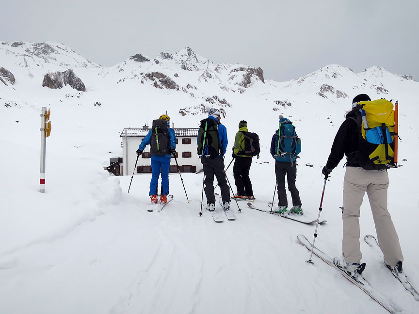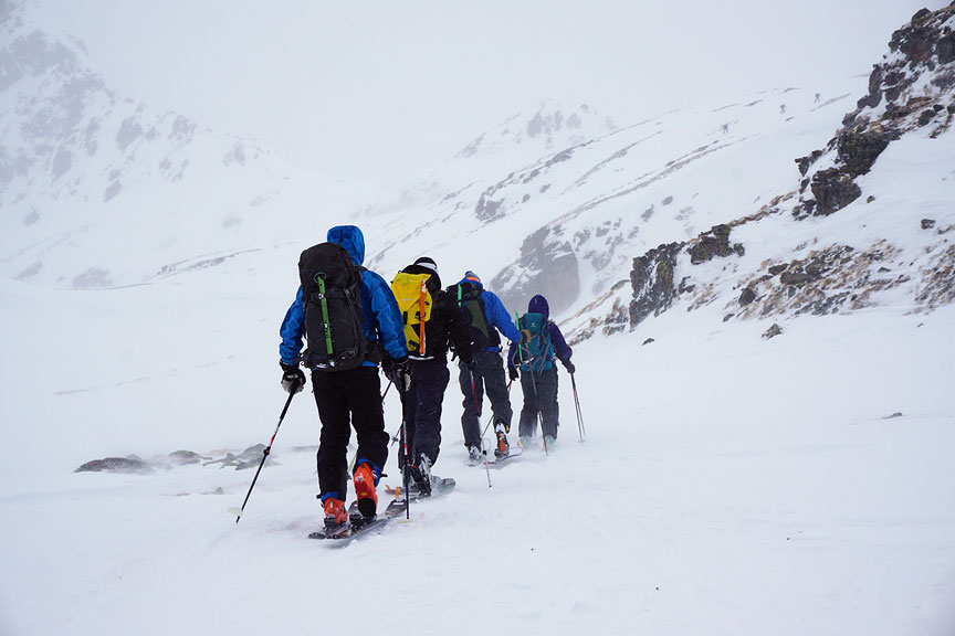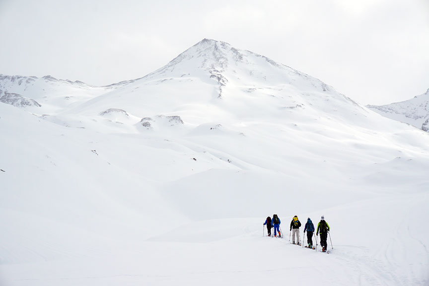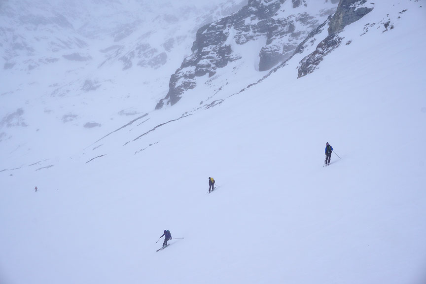 After a rather exciting descent in complete white-out conditions, we avoid creek bottoms and wind features and arrive safely at the Heidelberger hut. |