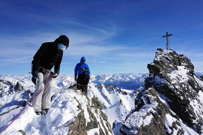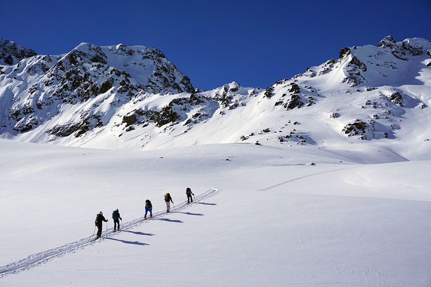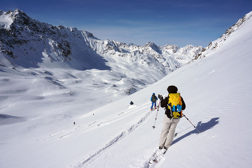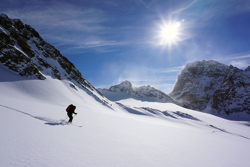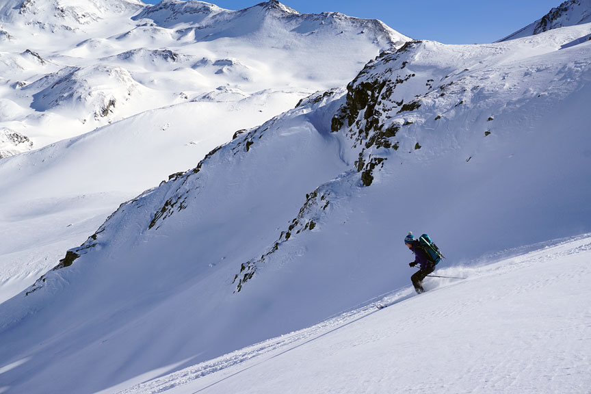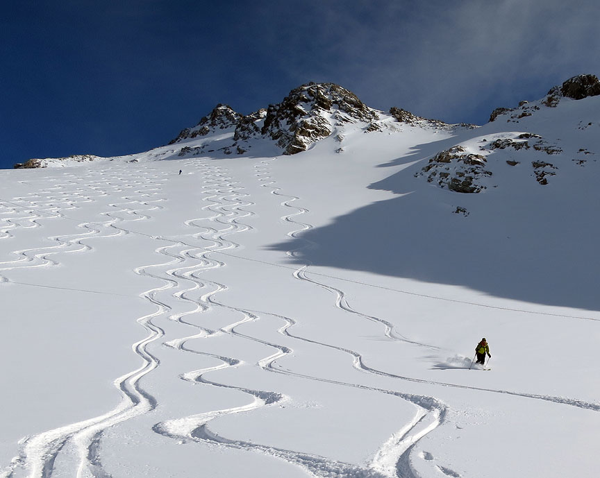 Nice snow as we approach the Ochsenscharte and the Dreiländerspitze. |