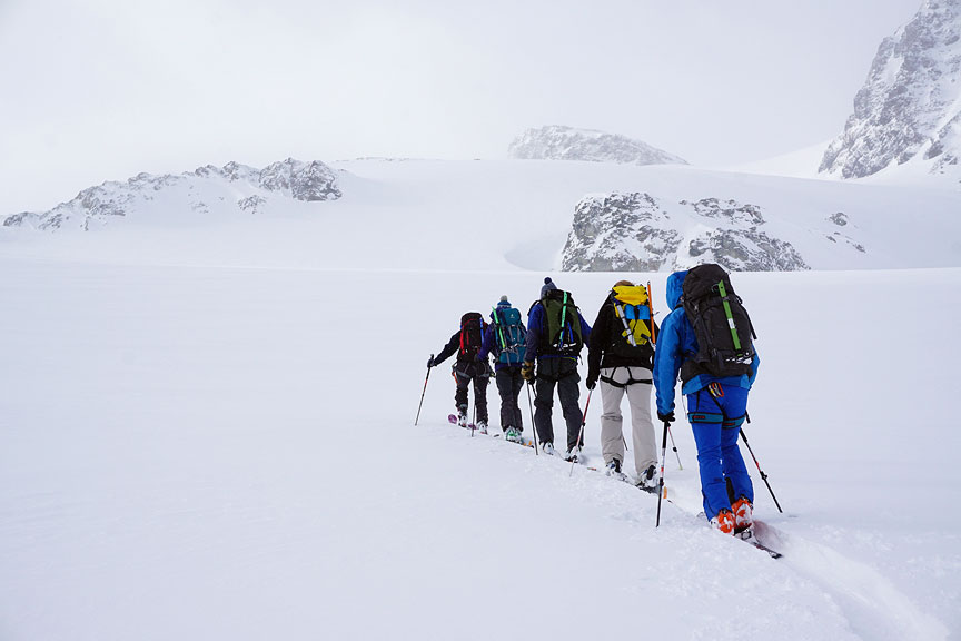 The following morning, day 5, dawns cold, windy, and foggy. We start out undaunted for an attempt on Piz Buin. |