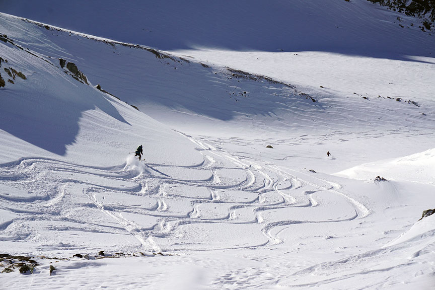 After a picnic lunch in the sun, we followed a skin track up to a powder stash... |