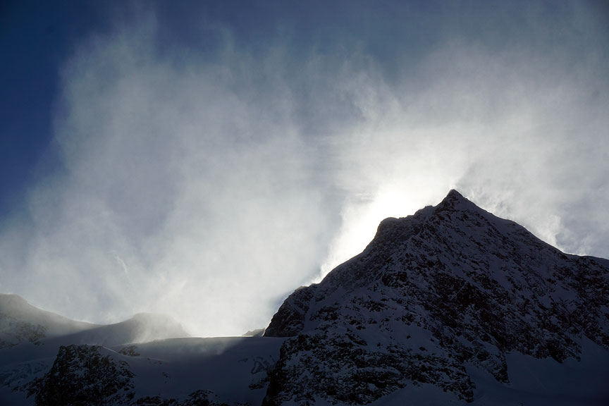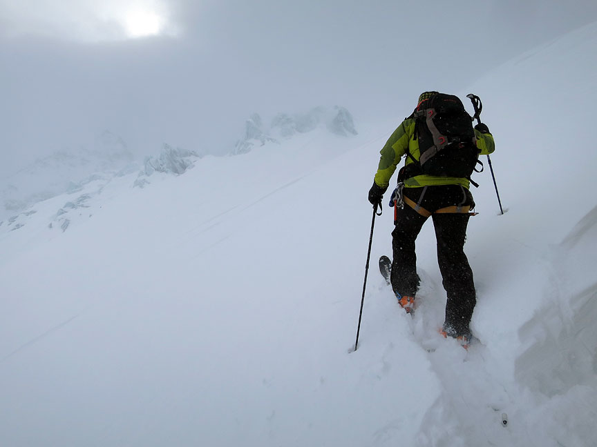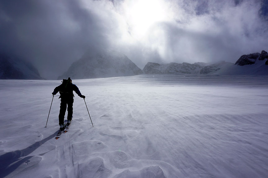 Persisten clouds along the ridgeline, and a buffetting headwind on the glacier, have us bundling up and hunkering down. |