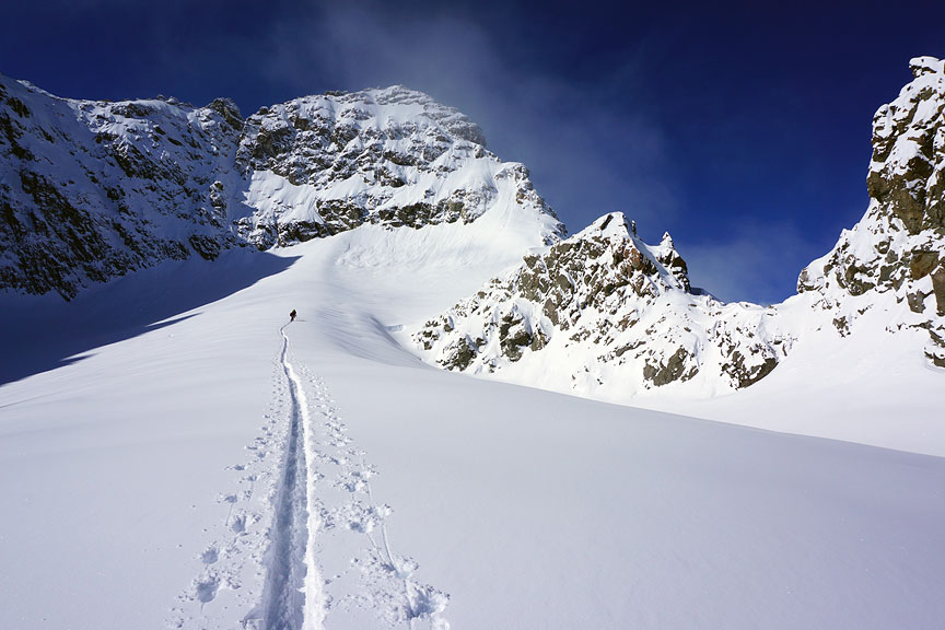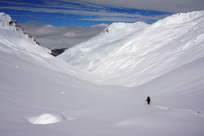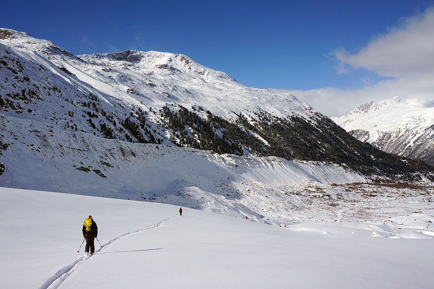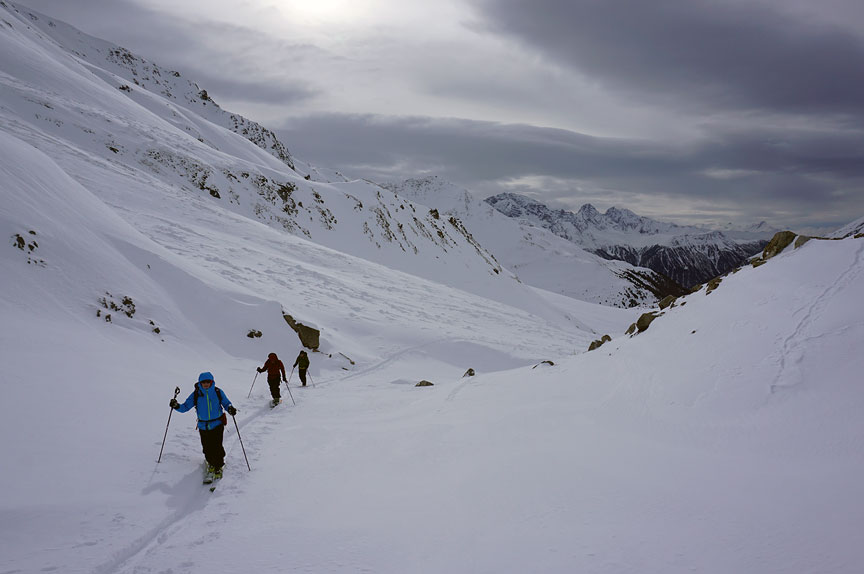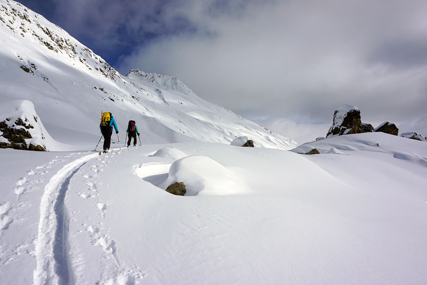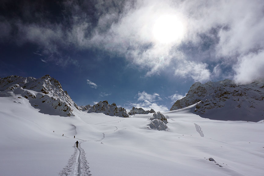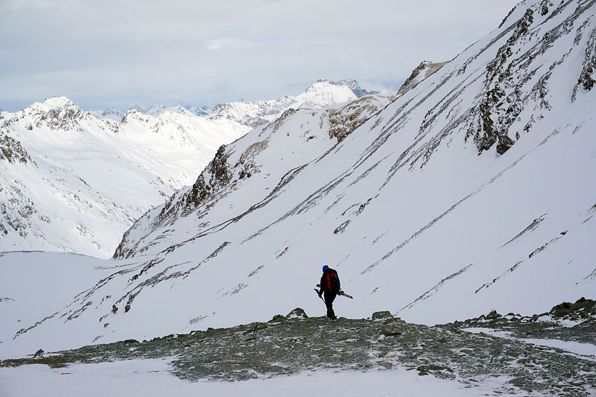 The snow cover was better for a recent storm, but still a bit on the thin side and the wind had been busy on the Fuorcla d'Agnel, so a few yards of walking were required. |