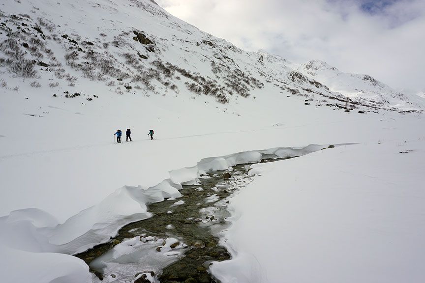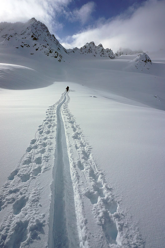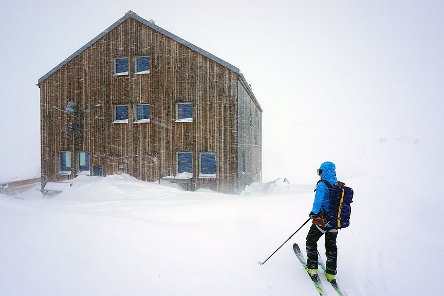 Breaking out at last above treeline, the last kilometers are exposed to the wind as the weather arrives. |