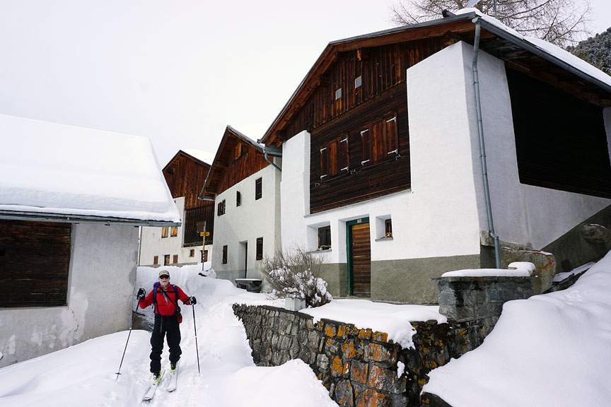 We wander up the Val Tuors past charming (deserted in winter) villages. |