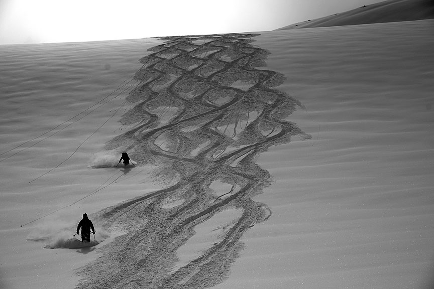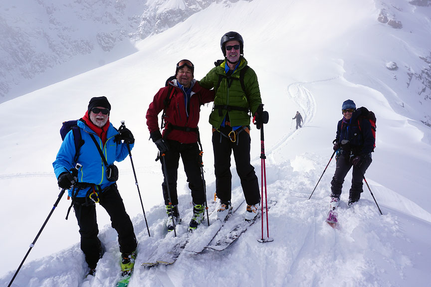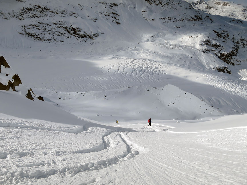 Avalanche conditions did not permit our usual skin and ski from the top of the Isla Perse, but we did get up on the moraine where we found some very good snow. |