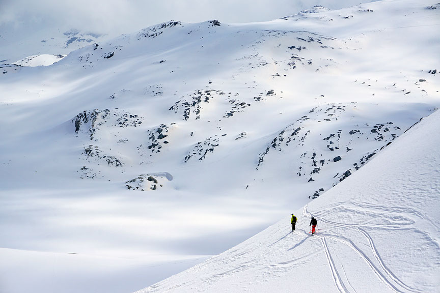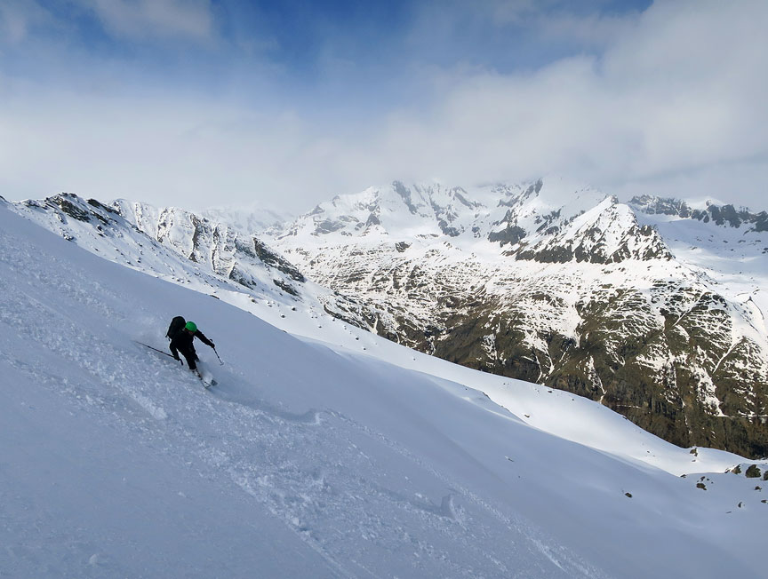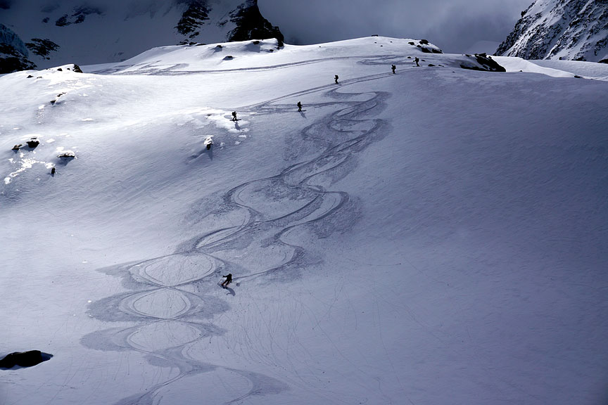 Warm weather had brought down many wet slides, but left plenty of pristine slopes as well. |