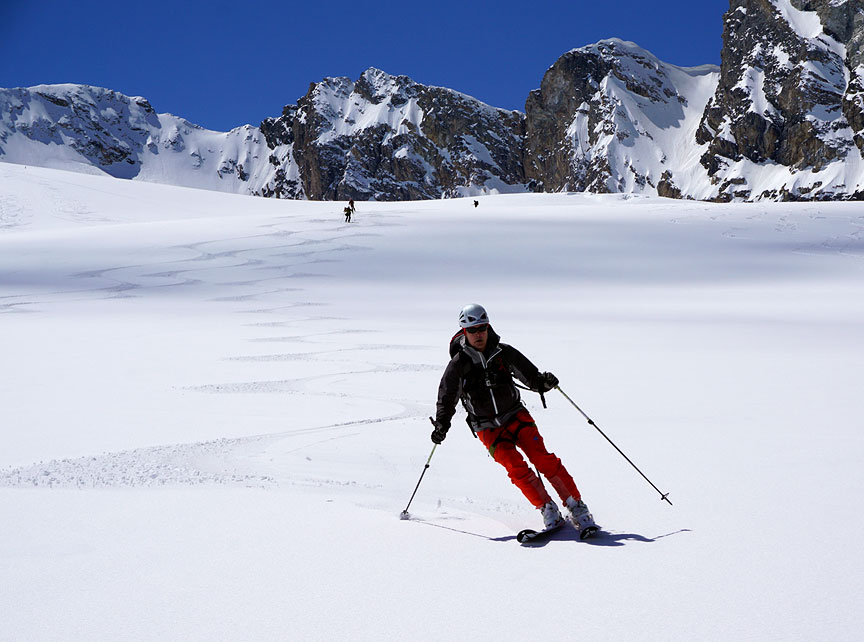 Discretion being the better part of valor, we decide to bail out from here. We will descend the Laveciau glacier past the Chabod hut, where we know there is good skiing to be had. |