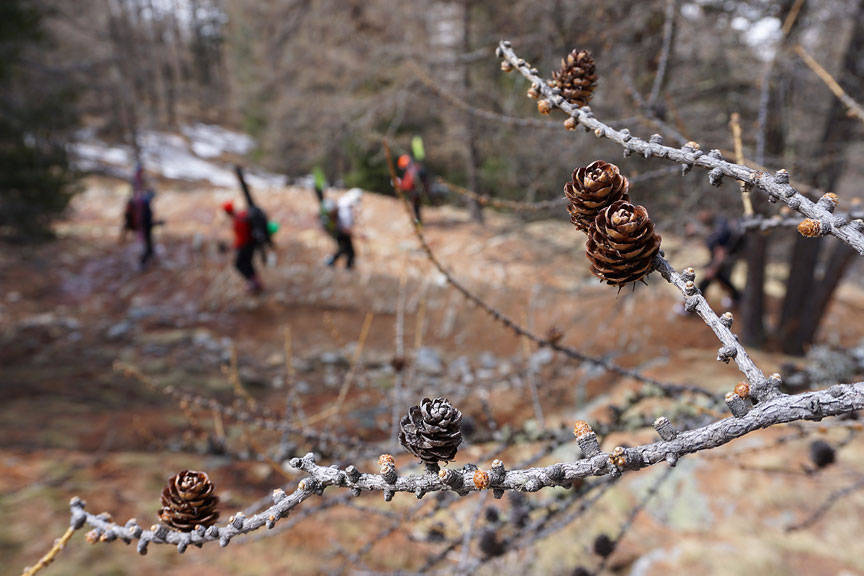 When we finally run out of snow, we have about a half hour or so of trail walking down through the woods with buds just about to pop out on the larch trees. |