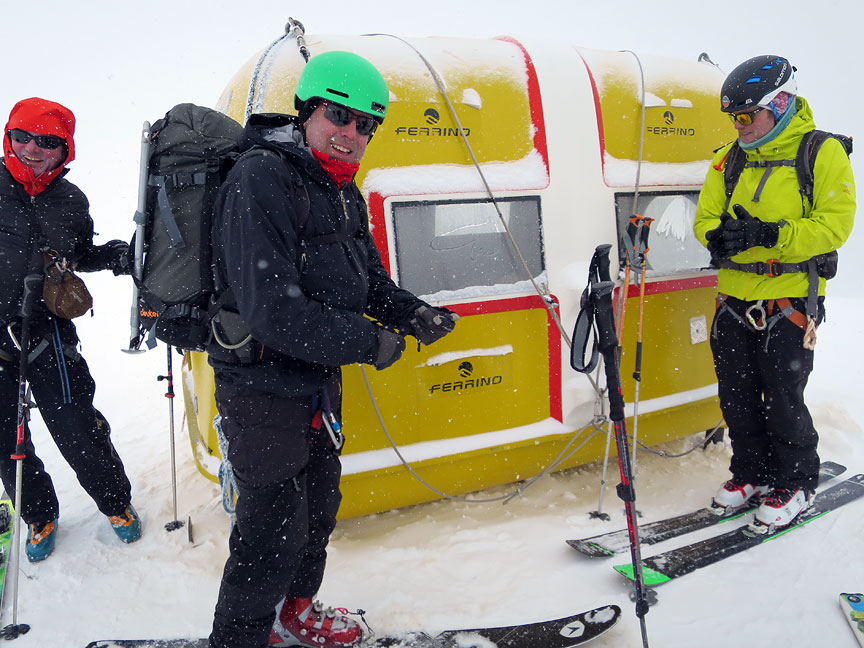 This tiny shelter, air lifted into place for an upcoming randonée race, provided scanty shelter from the wind as we reassess. |