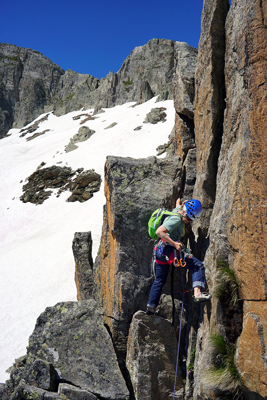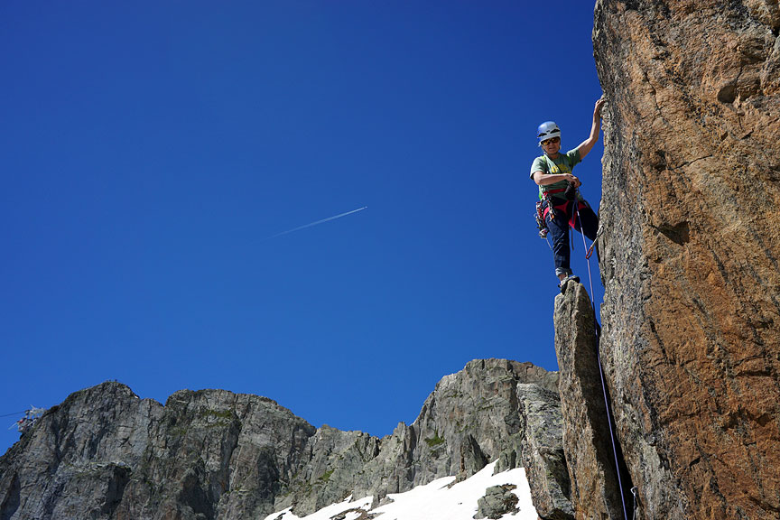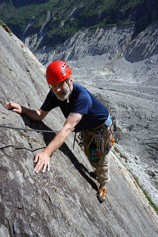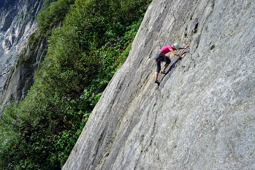 On our first day we headed up the Montenvers train to take in sunny granite slabs above the Mer de Glace. Gini takes the lead on one of our selected routes. |