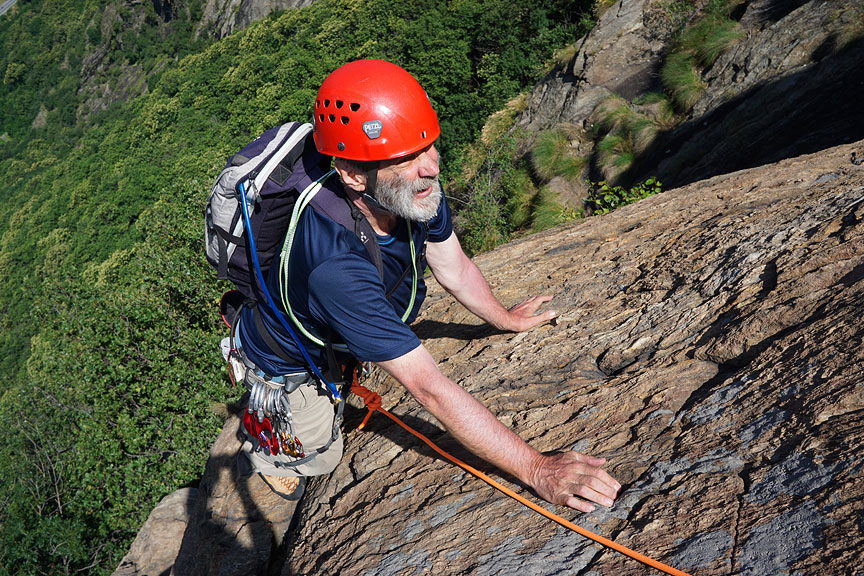 Gary mid-way through the route, enjoying the tiny features in the lovely rock. |