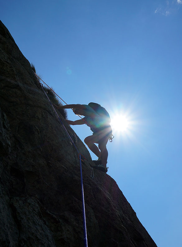 The highly entertaining tower pitch, seen from partway up the following one. Mark, come on down from there already! |