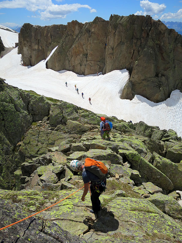 Day 4, it's back into the Aiguilles Rouges to climb Krakoucass (or some such spelling). Kathy looks desperately for... something! |