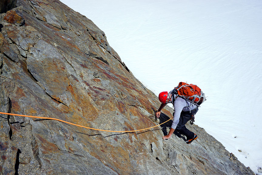 Downclimbing the short but slightly tricky section just above the glacier. |