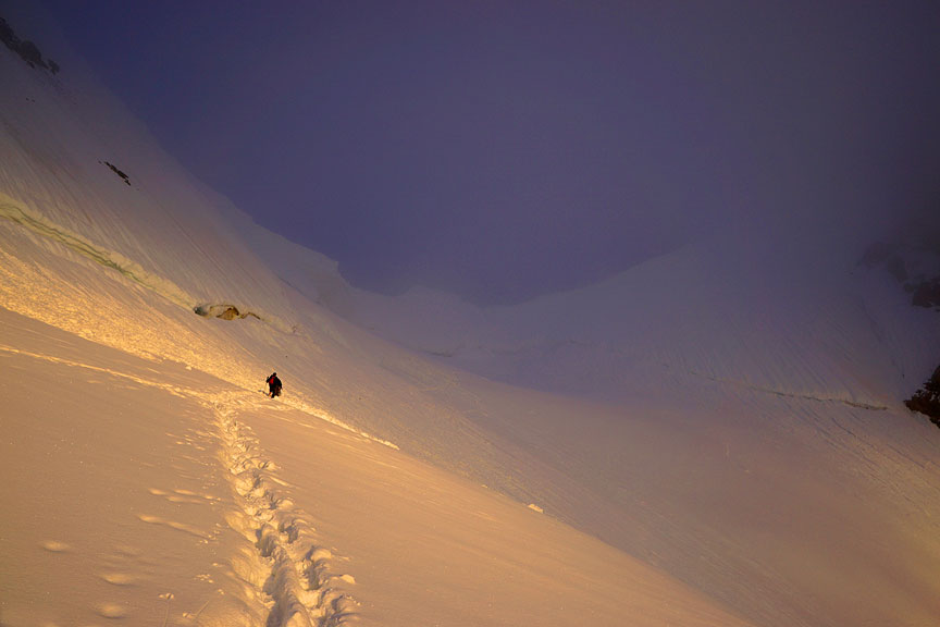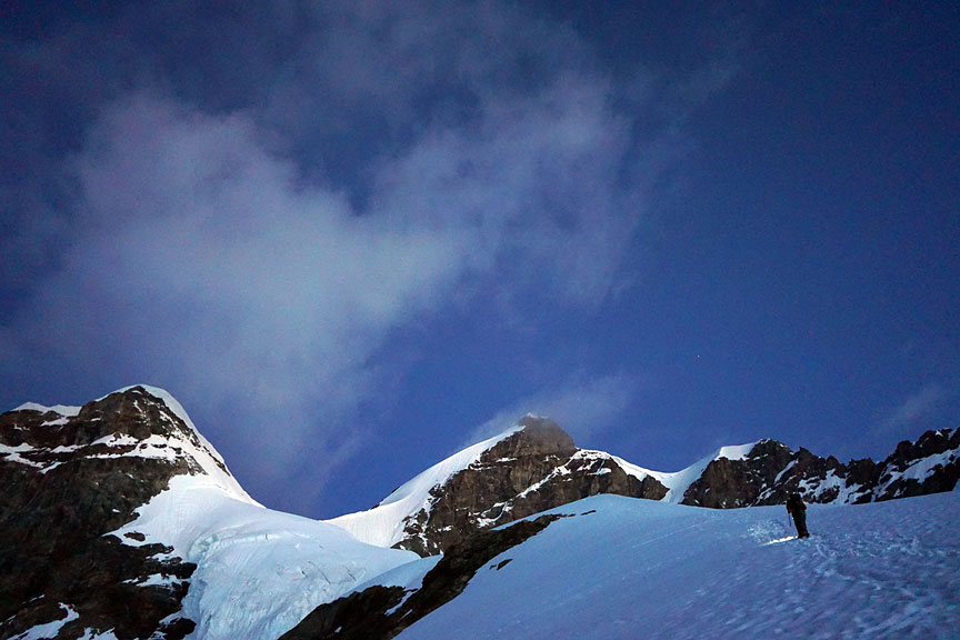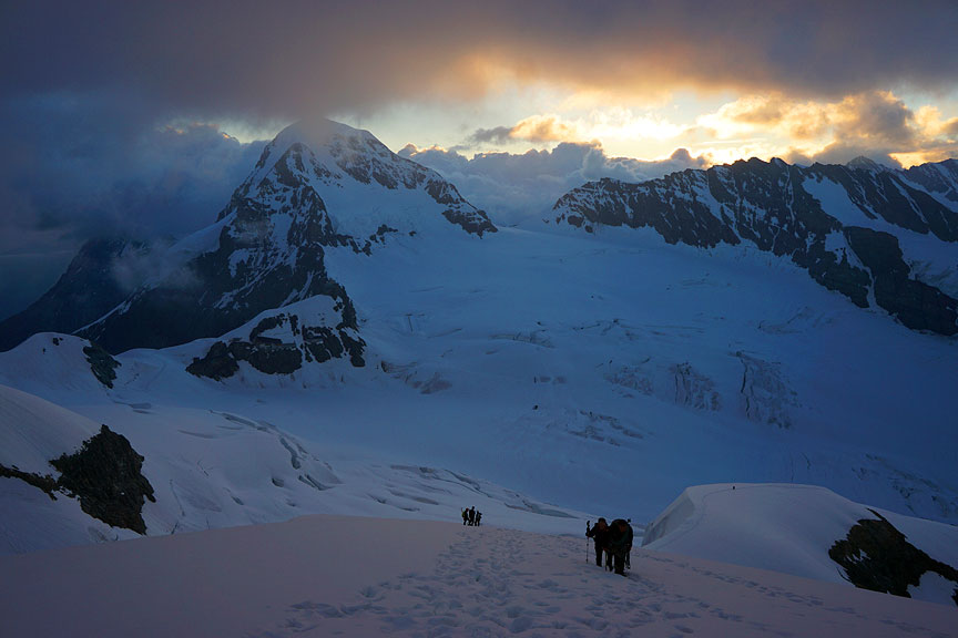 On our second day, despite a fickle forecast, we had a bit better luck on the Jungfrau. Here we are, at about 3500 meters, 5:30 in the morning. |