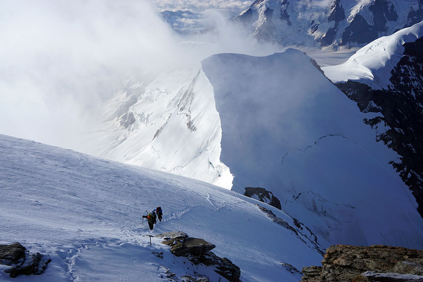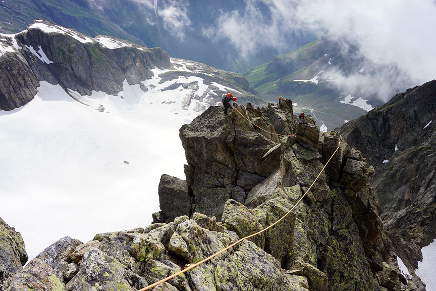 Day one, on the Mönch. Starting from the valley on the Mönch, always puts a bit late in the day. And on this very hot day, the snow had turned to much by the time we were high on the peak. Fearing poor conditions on the exposed summit ridge traverse, we called the rocky section at 2/3 height our "summit". |