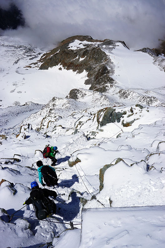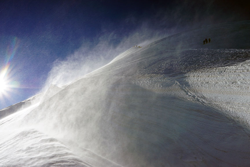He times his climb well. The day before, the weather was poor and it snowed quite a bit up high. |