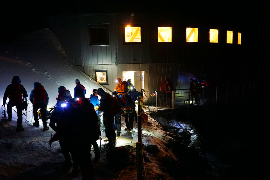 2:00 am breakfast. The teams gather outside the Gouter hut. |