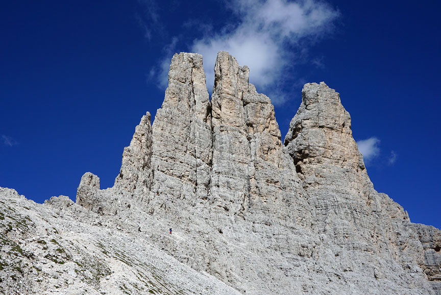 On our last day, we traversed the Spigolo del Pollice, Cinque Dita, the middle group in this photo. |