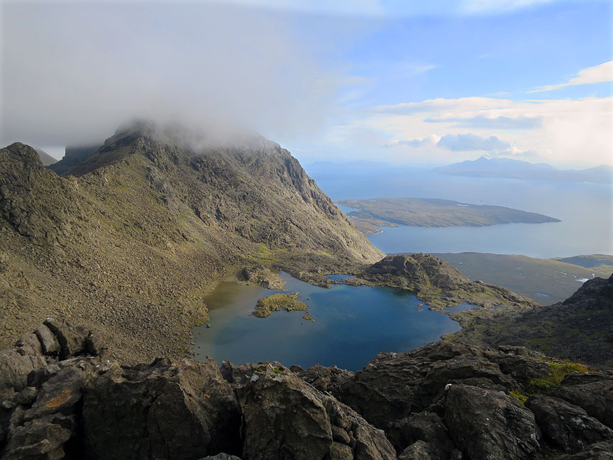 After two long days on the route, we had to confess our progress was too slow and we were not keen to push for the complete traverse in one go. So we descended to civilization... This high tarn shows Skye at its cheeriest, in mediterranean-esque sunshine. |