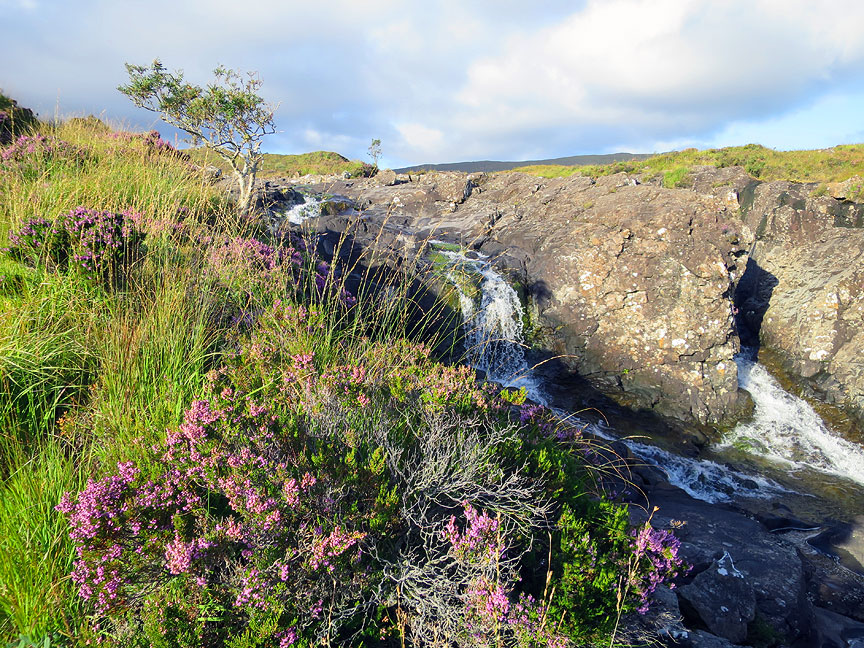 When the forecast improved, we headed back in to check out the other end of the traverse. The heather moors above Sligachan were beautiful in the morning sunshine. |