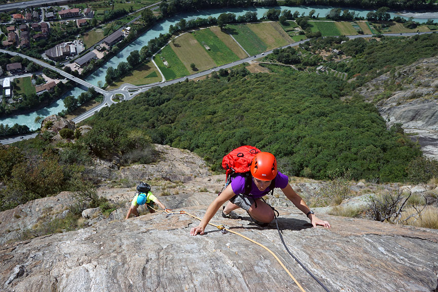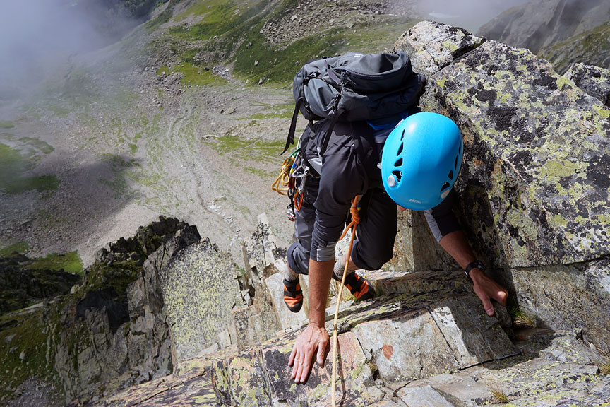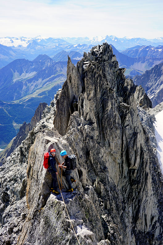 On day 3, the weather on the France side of the range was gloomy and wet. But a quick trip through the Mont Blanc tunnel brought us back into the sun . We climbed a route called Dr Jimmy, on Mount Coudrey. |