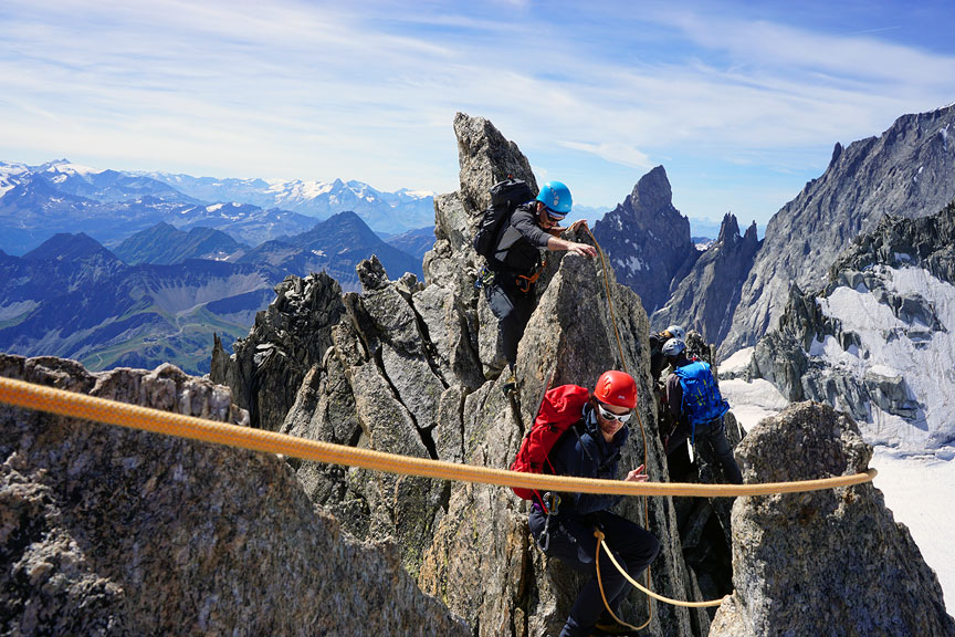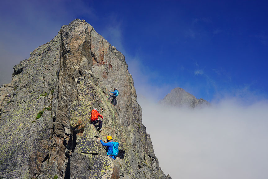 Traversing the final rocky spires near the summit. |