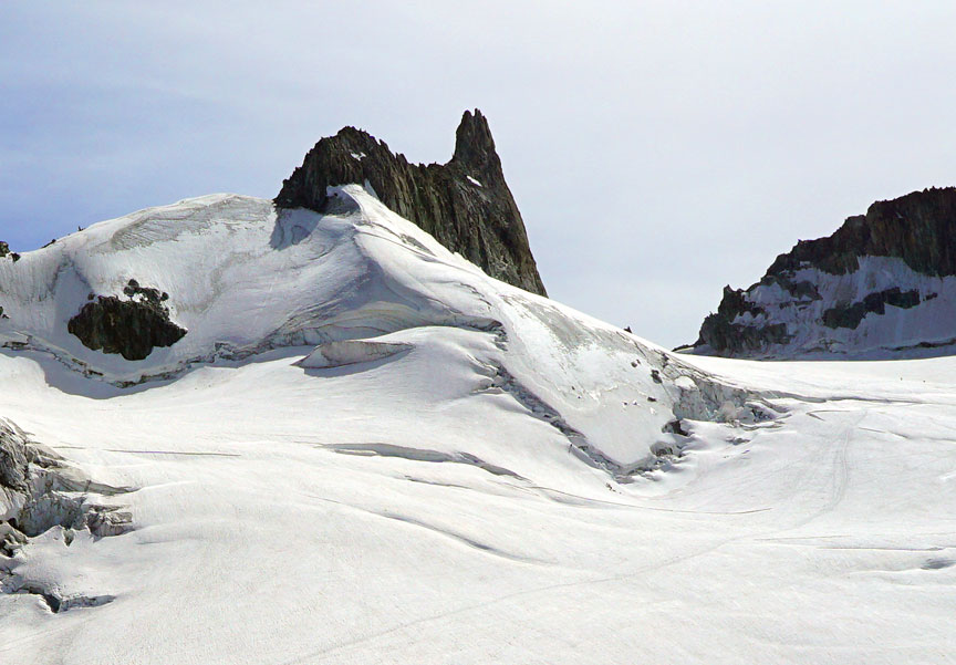 A view of the Aiguille d'Entrèves from the Panoramic lift, which we used to "approach" the peak. The route climbs from the col to the right of the peak, traverses both summits to the snowy shoulder below the left-hand summit. |
