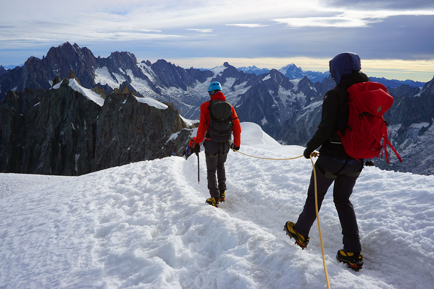 On day 2, under somewhat threatening skies, we climbed the classic Arête des Cosmiques on the Aiguille du Midi. On the approach to the climb. |