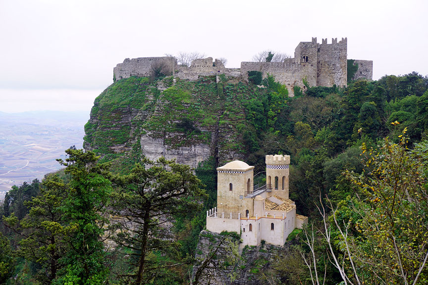 Venus Castle above (dating from Norman times, about 1000 years ago) and the Torretta Pepoli (originally built in 1870) below. |