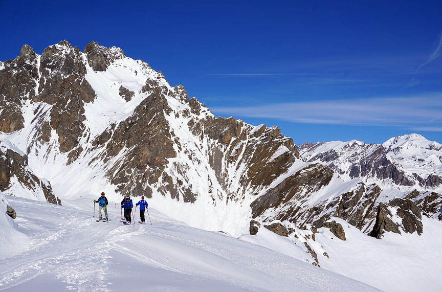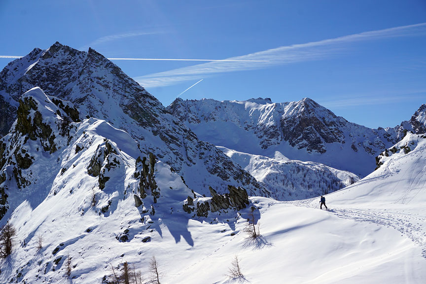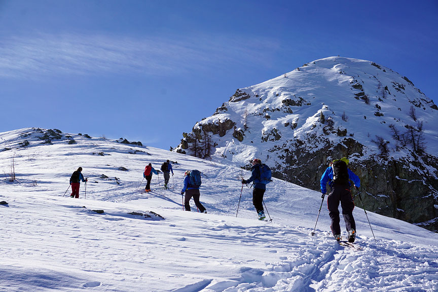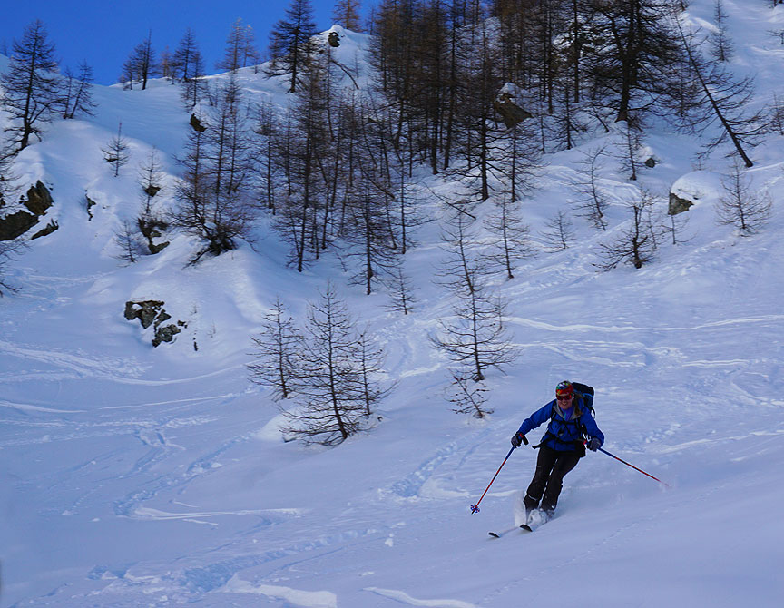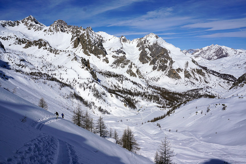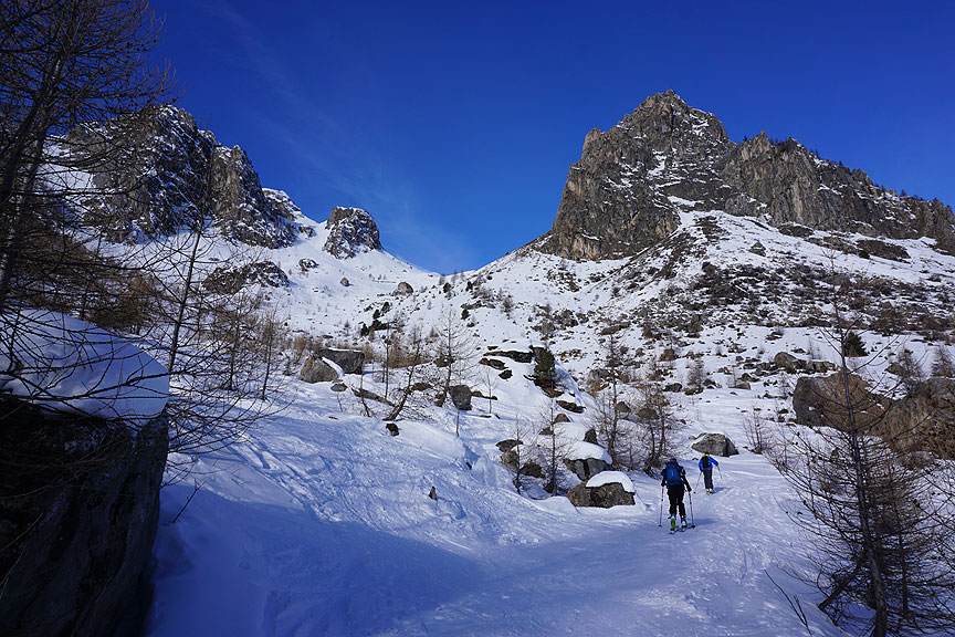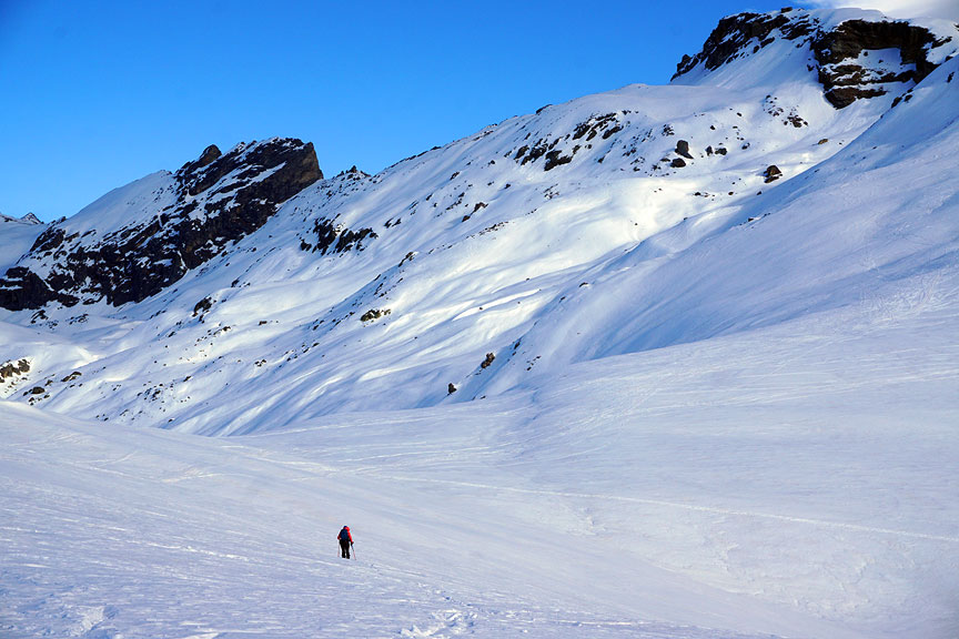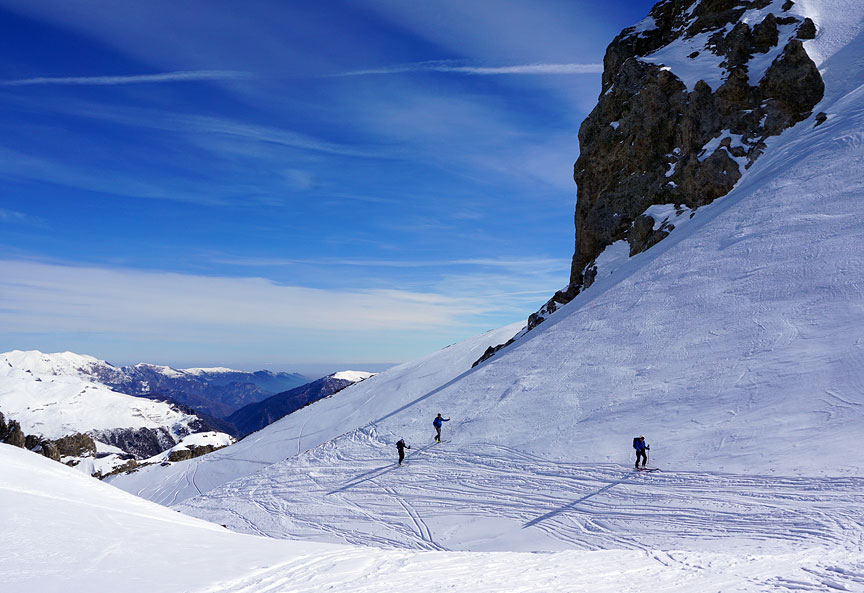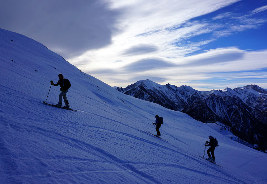 Skinning up the broad gentle slopes of the Comba Castellazzo. |