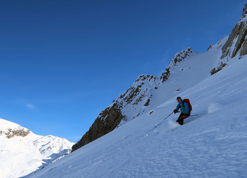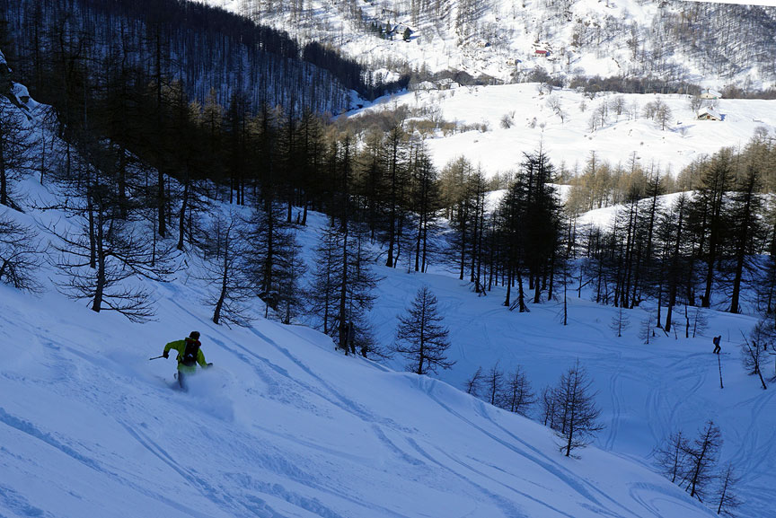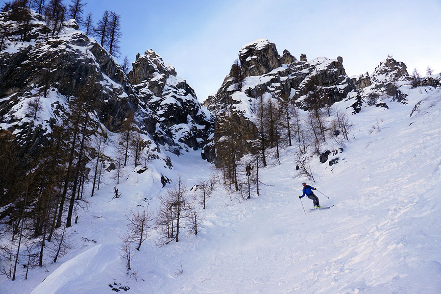 By staying ever-left, we found the longest powdery descent back to the valley. |