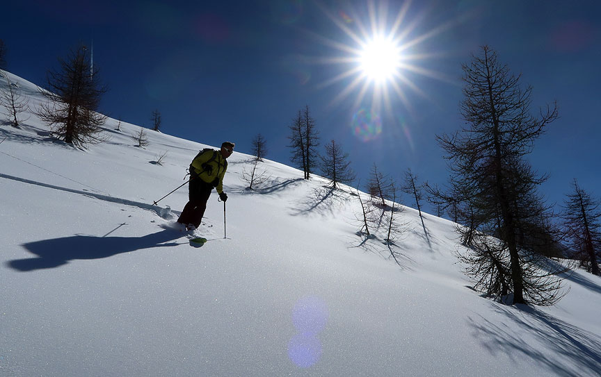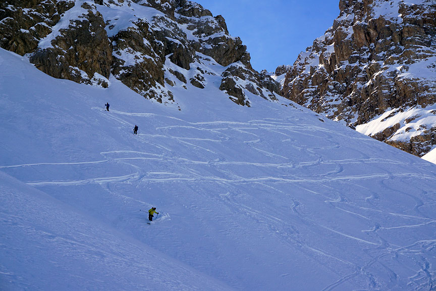 After a rather firm, but still very fun start off the summit of Ruissas, the snow starts to soften on the slopes of Monte Cappel. |