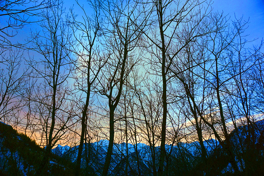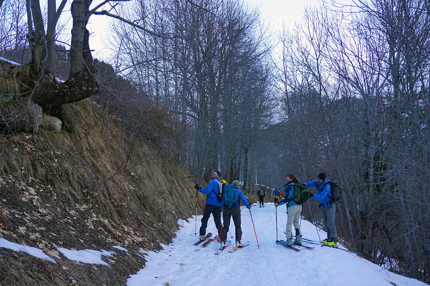 On day 4, we decided to switch tactics and ski sun-transformed snow on a south-facing aspect. Monte Ruissas was the summit of choice. In this photo we are just starting to skin up the road near Colombata. |