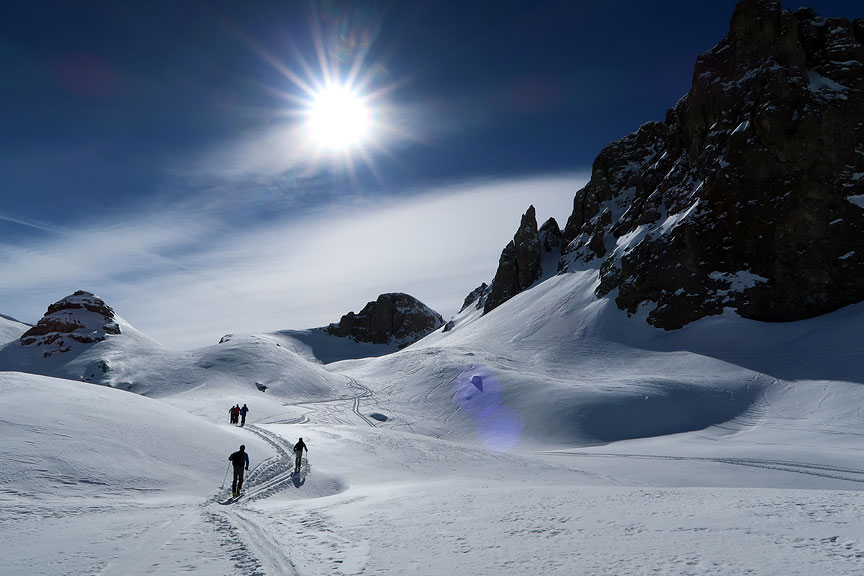 ON our second day, we decided to go for a longer tour, the Tour of Repiatetta. For this excellent route, we start in Chialvetta. In this photo we are skiing literally through the hamlet of Pratorotondo, just as the sun arrives. |